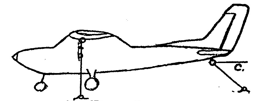 Now move to the tail rope. Put the end through the airplane's tie down ring, as shown at C in Figure 1. Get a good grip on rope C (wrap it around your hand once). Then, with the rope, pull the airplane rearward as fast and far as you can. The movement and momentum of the airplane will tighten the front ropes! Be sure to keep the pull on the rope. Move one hand up rope C to within about six inches of the tail ring and hold the tension there. While holding this tight, tie 2 interlocking half hitches, like you did on the front ropes.