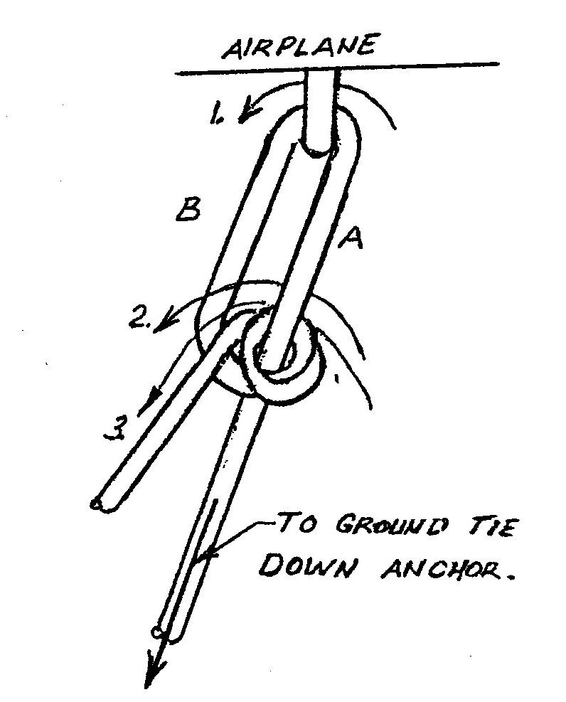 Bring the rope through the airplane's tie down ring, as shown by arrow 1, and hold part B snug while tying the rest of the knot. Tie the first knot about six inches down from the top. The end of the rope now swings around the part going to the ground, labeled A, and out between A and B, as shown by arrow 2. Swing the end around part A again, as shown by arrow 3. Pull the end tight and snap it between the first loop and part B. When this is tied, make one more knot just like the fast one but about six inches below it. Finish this off with a simple overhand knot to secure the loose end.
